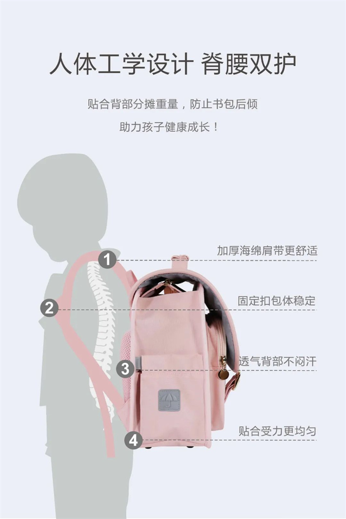 重力上移至腰椎之上,兩款背包皆采用中空無壓減負設計呵護小公主小王子的健康成長.