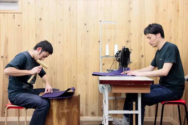 捶打會(huì)由比較資淺的工匠在一個(gè)圓木樁上進(jìn)行。敲出折角后,再交給資深的前輩進(jìn)行縫紉。據(jù)說(shuō),他們家工匠隨著制作帆布袋技術(shù)的提升,從圓木樁走到縫紉機(jī)這個(gè)面對(duì)面的距離,所需要的時(shí)間是 7-8 年。